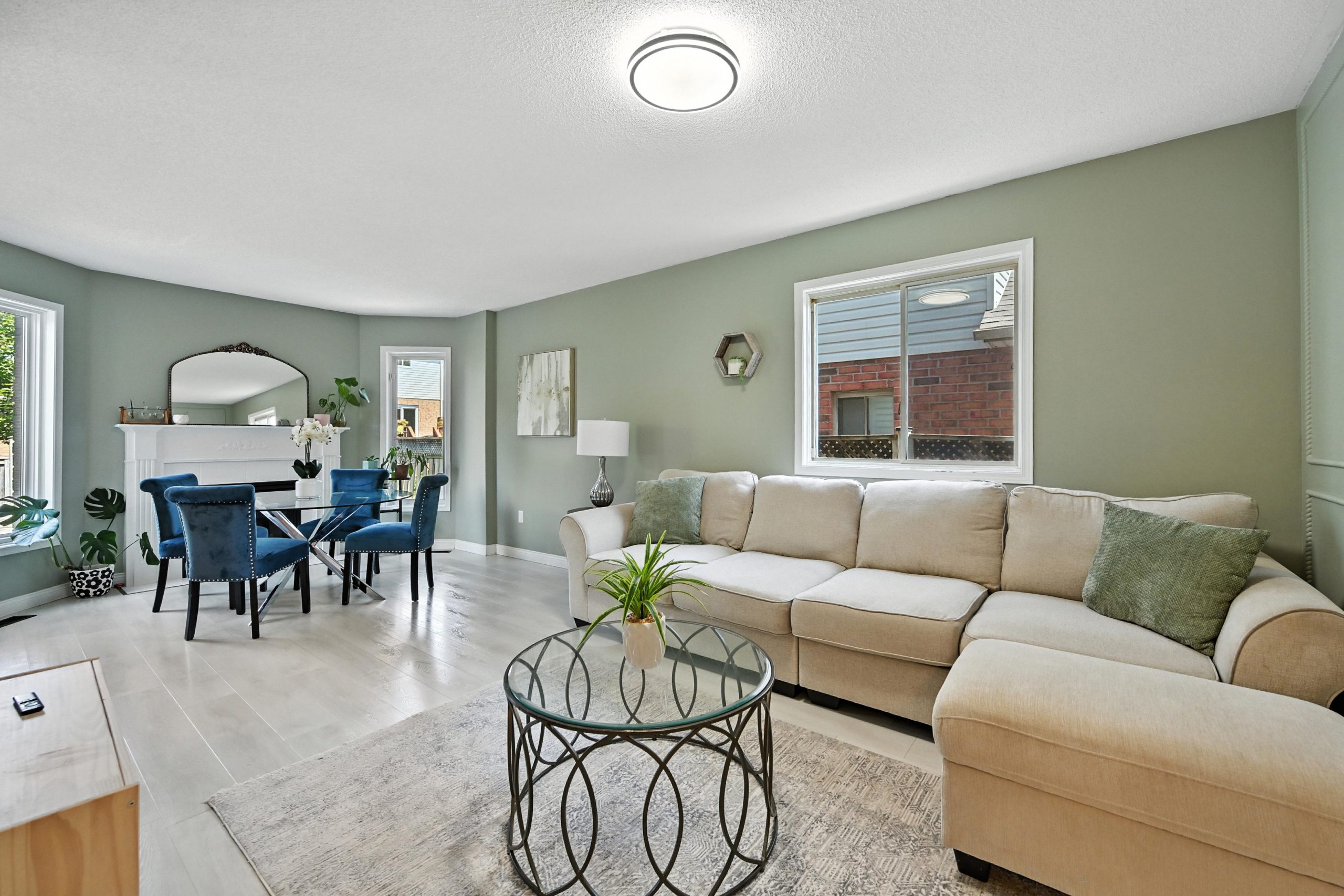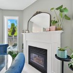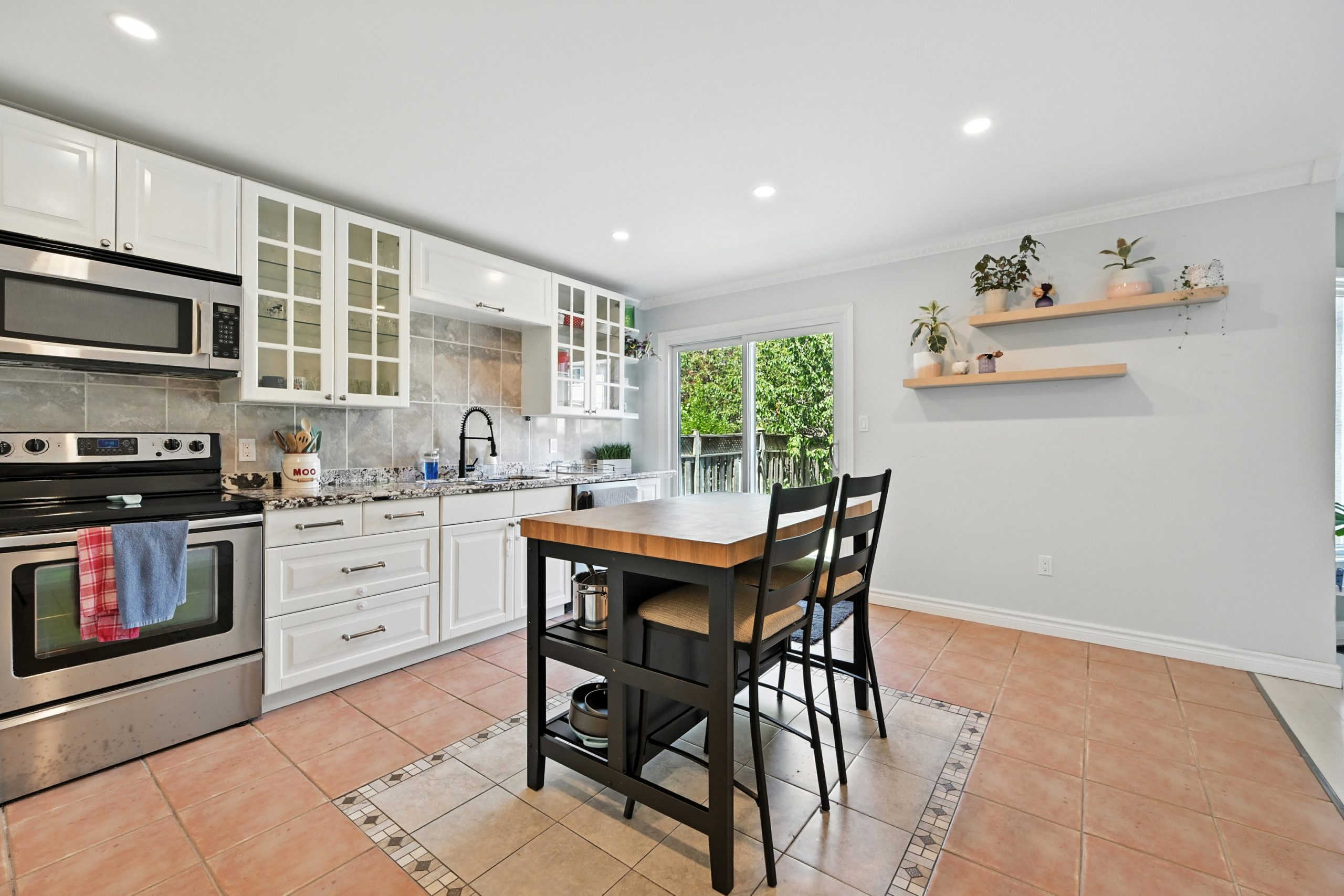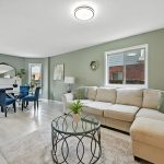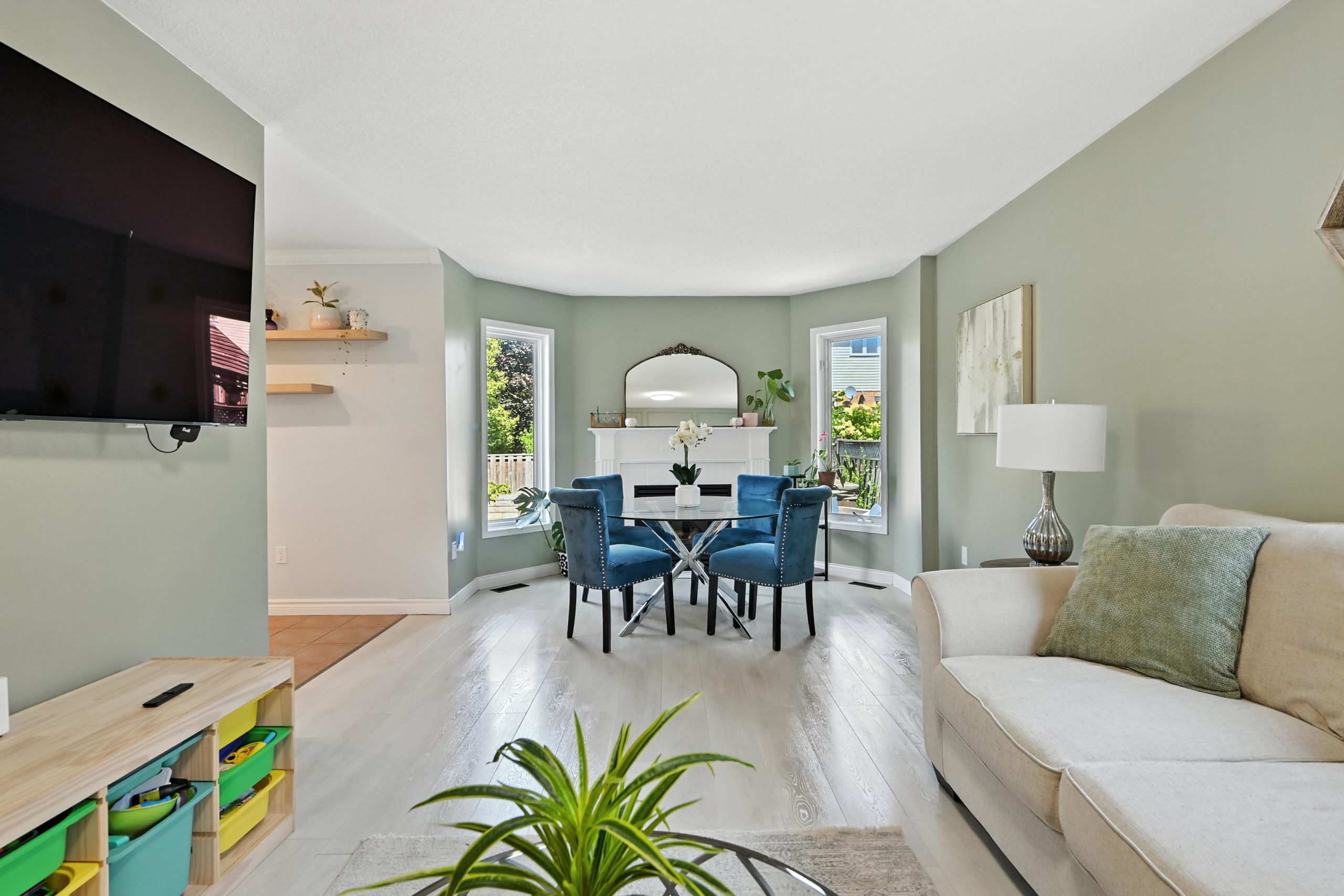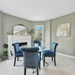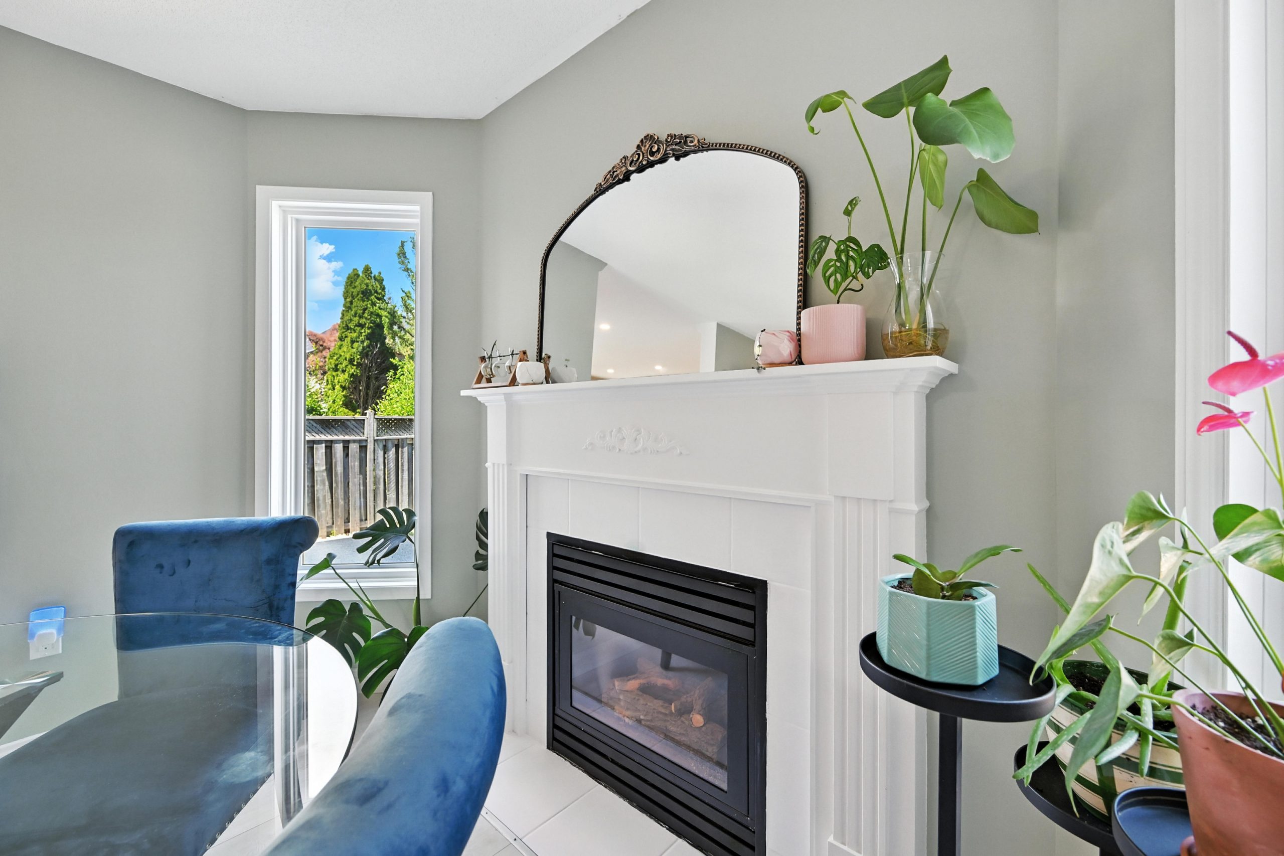 The bright and functional main floor features a spacious open concept living and dining room that are highlighted by oversized windows and a gas fireplace, both with their own entry into the kitchen. The updated kitchen features crisp white cabinetry, granite countertops, a tiled backsplash, stainless steel appliances, a central island with bar seating, and sliding doors that lead directly to the backyard, making indoor-outdoor entertaining seamless. A stylish powder room completes this level.