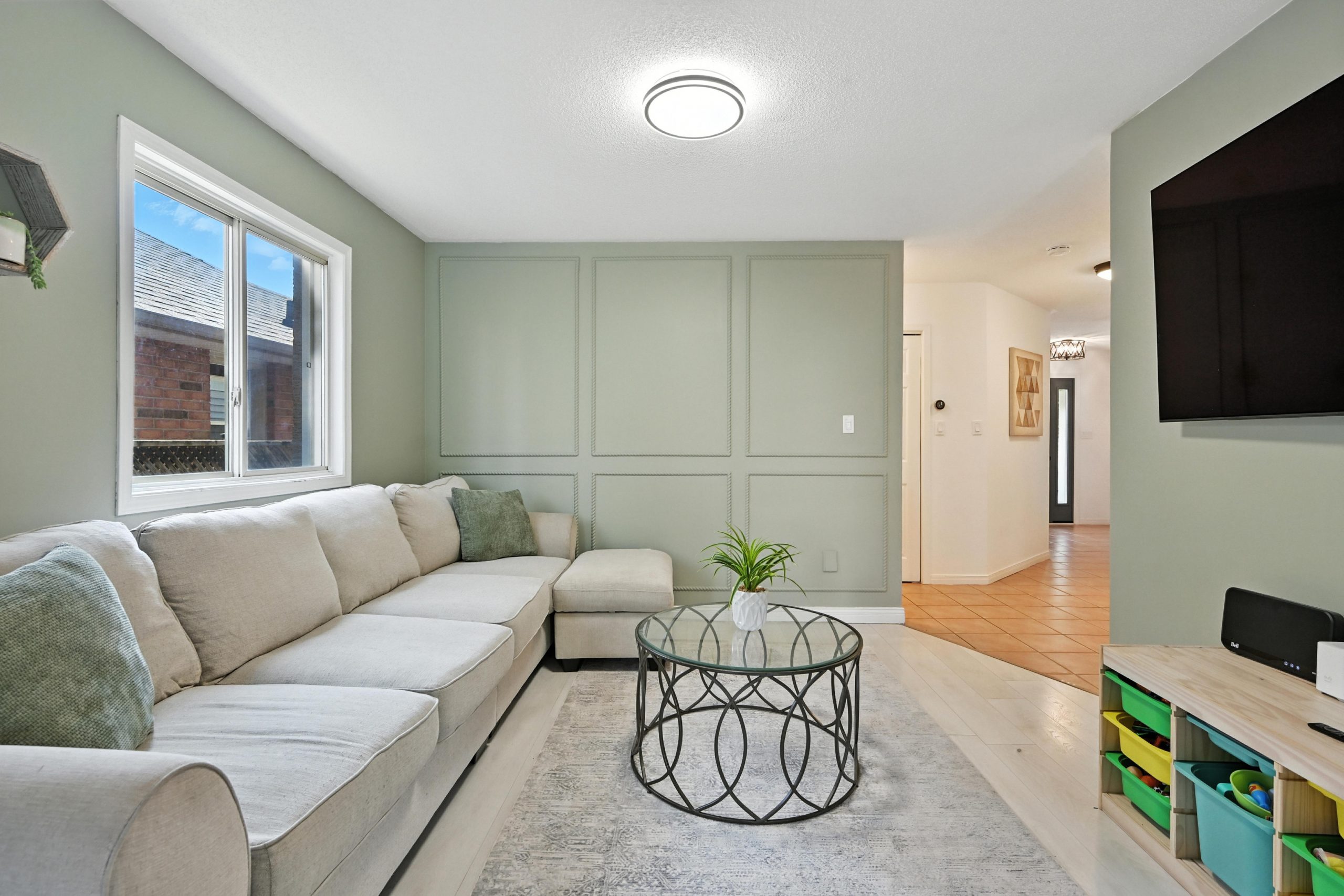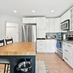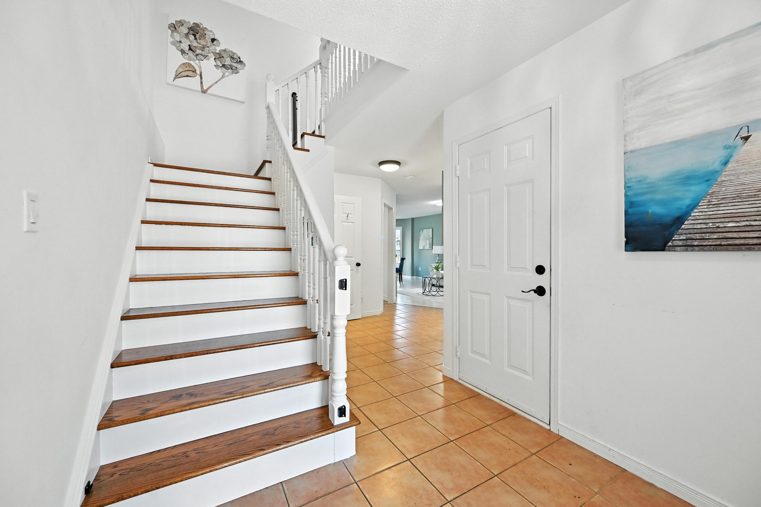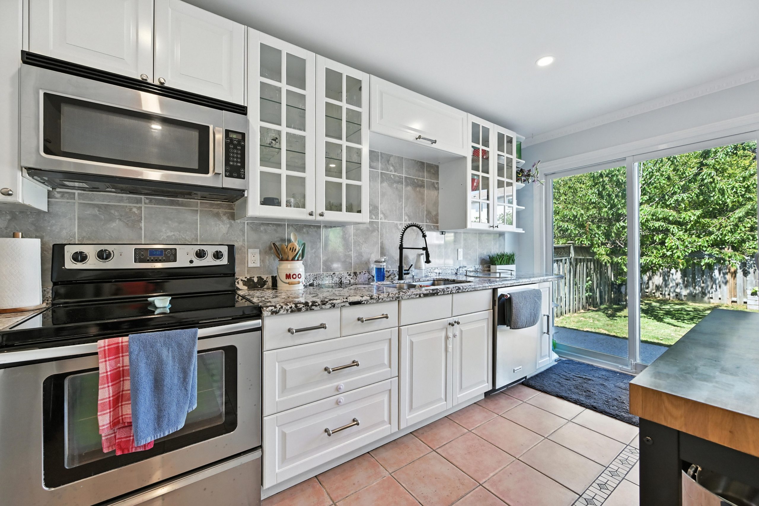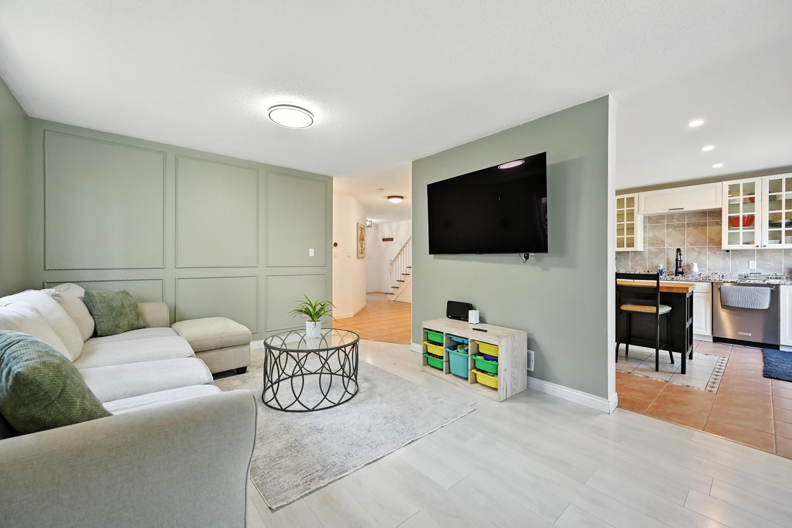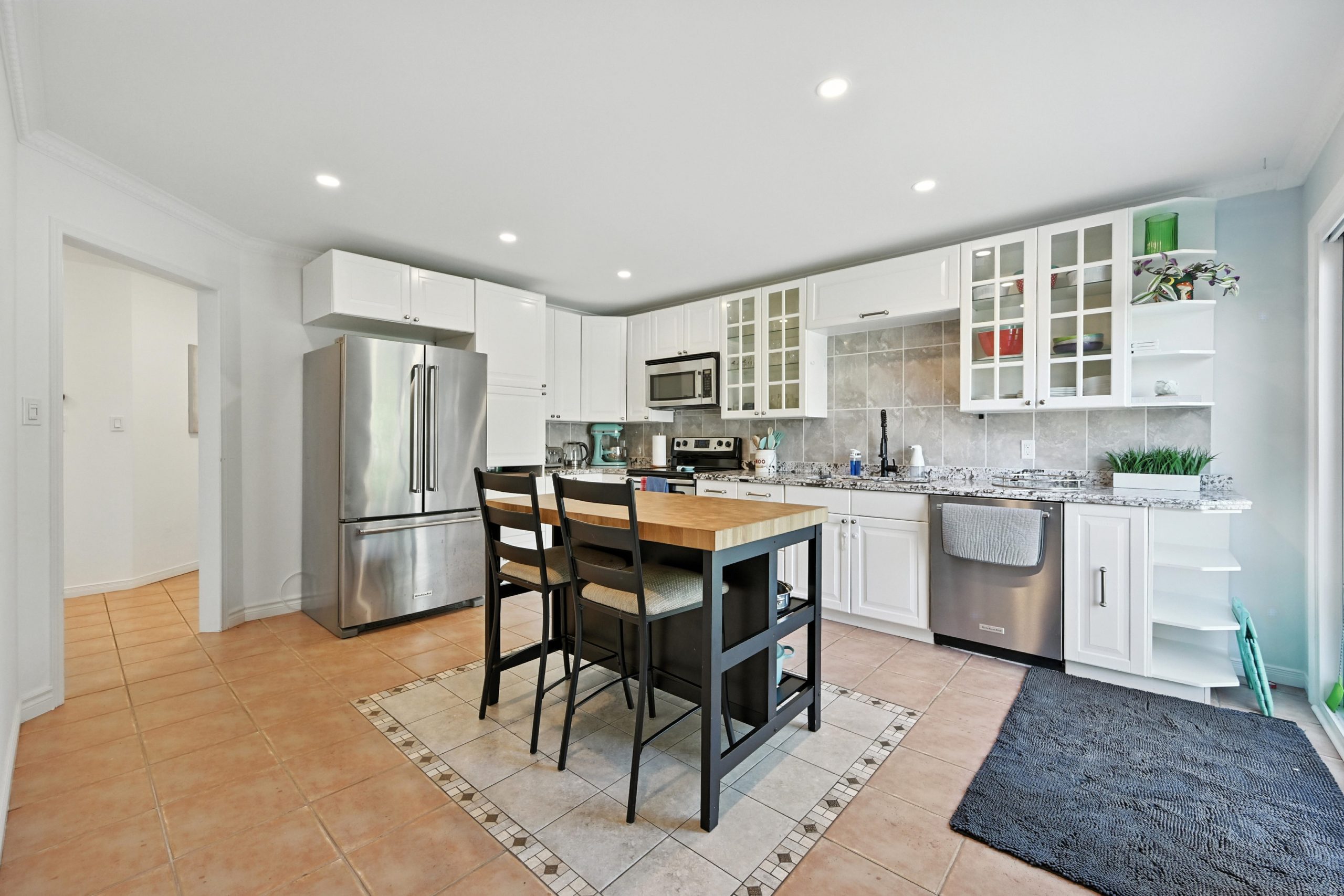 The bright and functional main floor features a spacious open concept living and dining room that are highlighted by oversized windows and a gas fireplace, both with their own entry into the kitchen. The updated kitchen features crisp white cabinetry, granite countertops, a tiled backsplash, stainless steel appliances, a central island with bar seating, and sliding doors that lead directly to the backyard, making indoor-outdoor entertaining seamless. A stylish powder room completes this level.