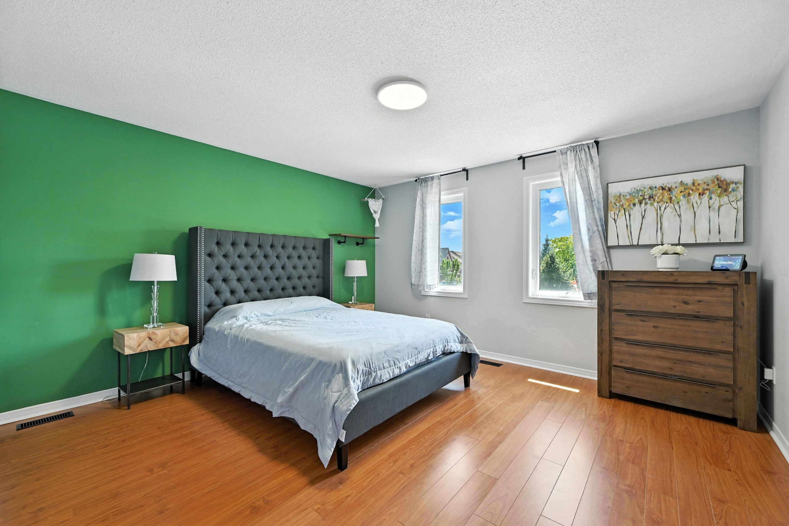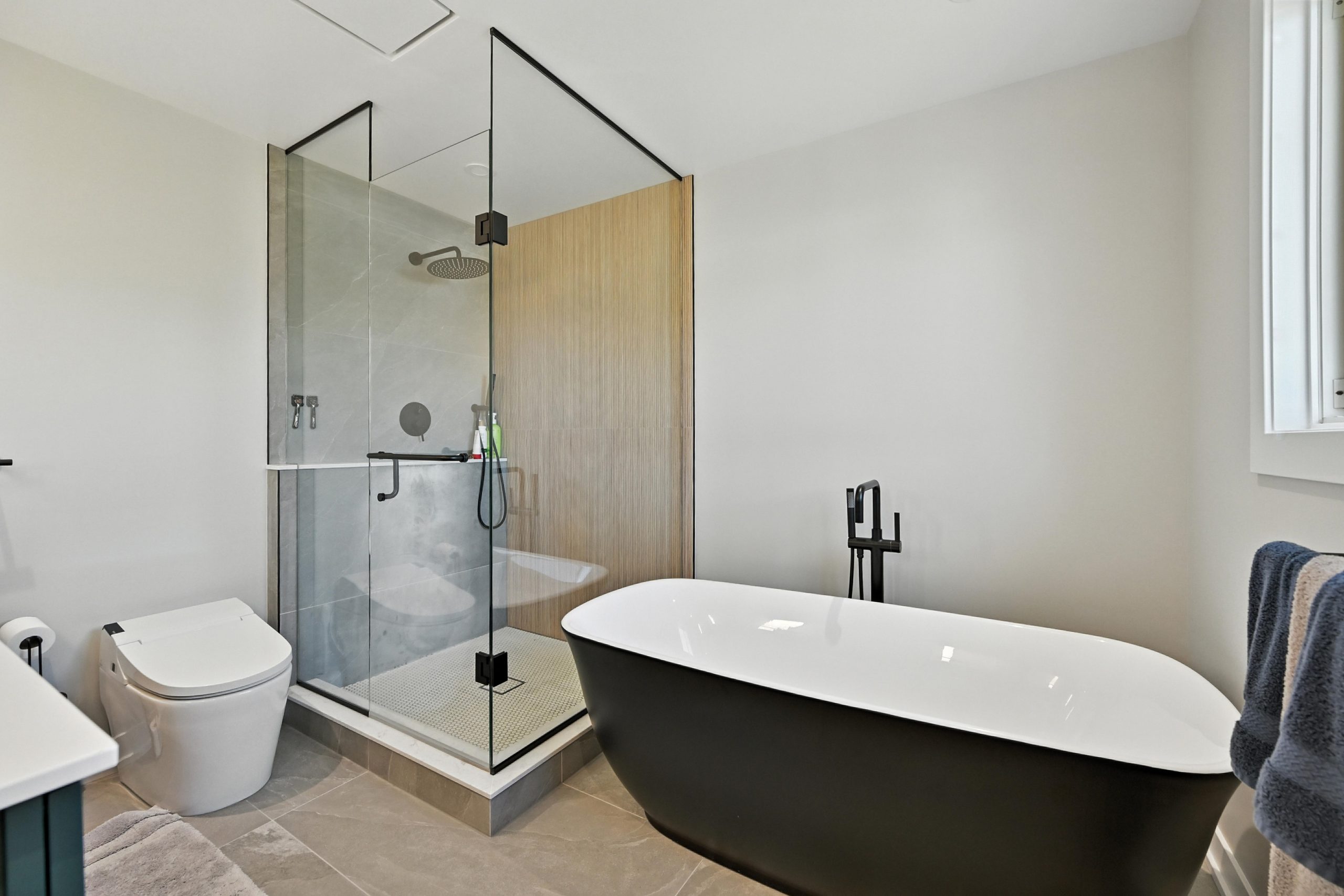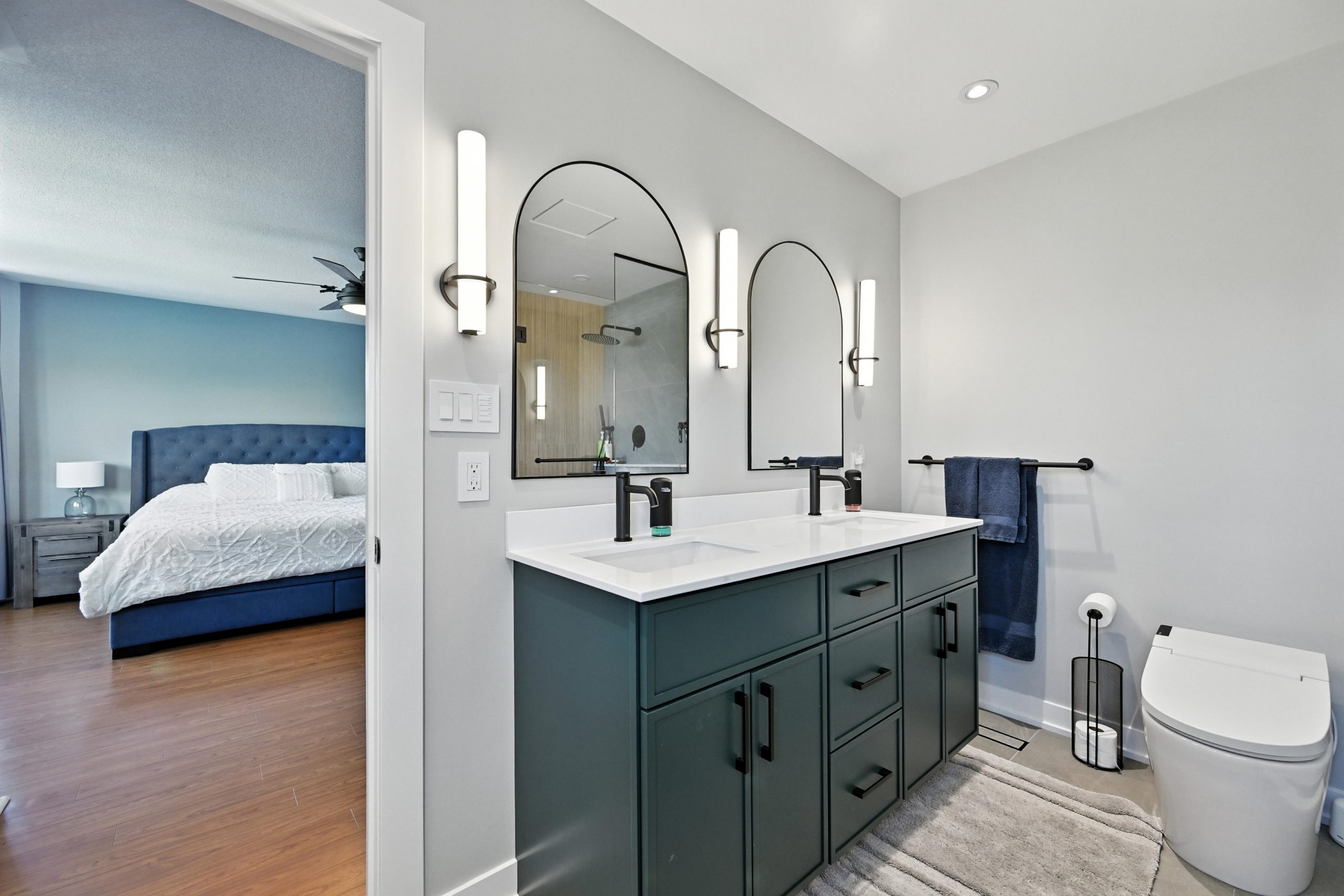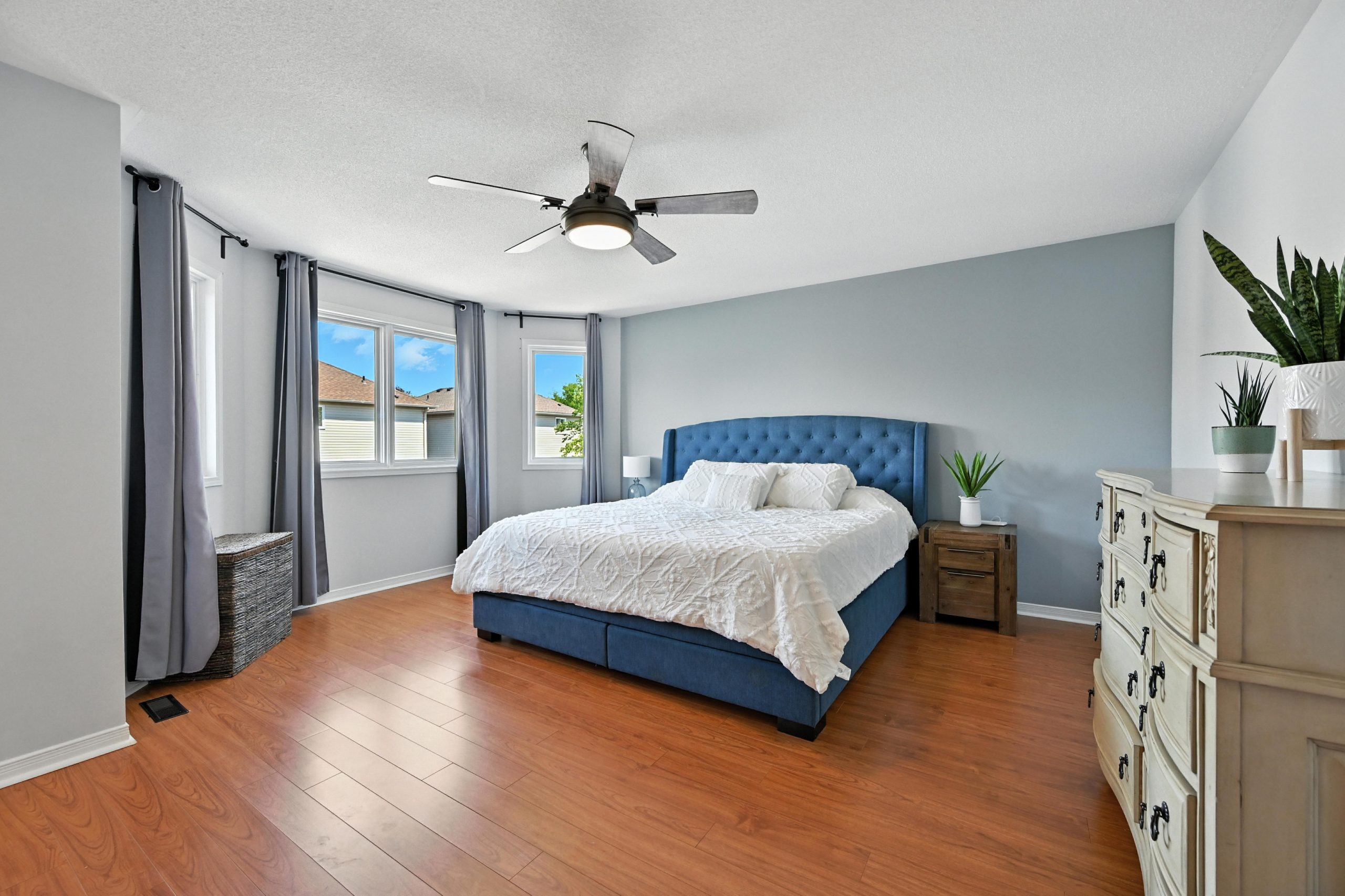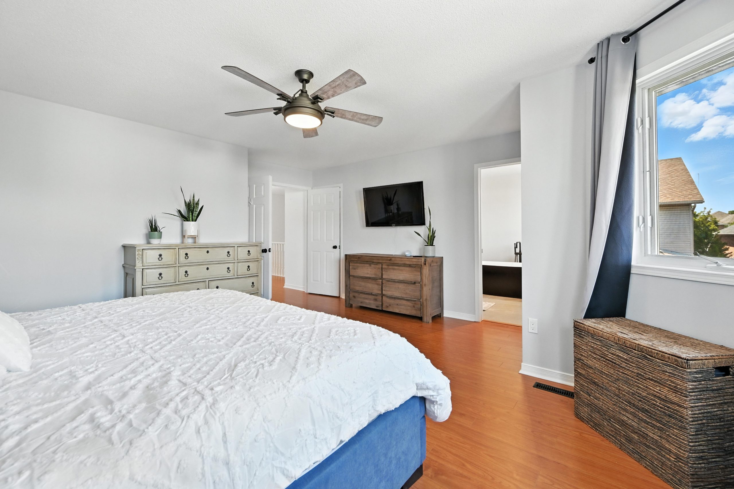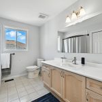 Upstairs, the sunlit primary suite offers generous space, including a large walk-in closet, and a spa-inspired ensuite with a freestanding tub, glass-enclosed shower, and double vanity. The 2nd & 3rd bedrooms are both well-sized with large closets and windows spanning across the back wall. The second level also features a second full bathroom, as well as a very large laundry room…which is everyone’s dream!