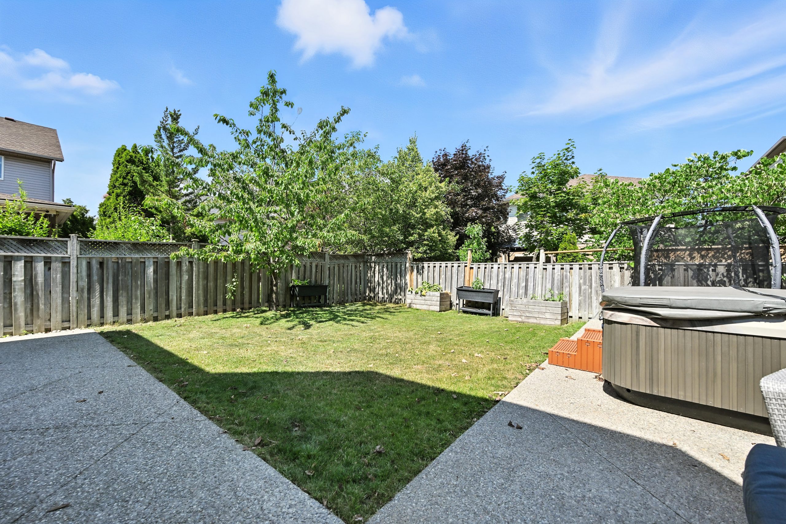 The spacious backyard fully fenced backyard features a large concrete patio with ample seating space, and plenty of grass for kids or pets to roam and play. The hot tub adds a great touch to this backyard retreat. Whether you’re entertaining or unwinding, this backyard delivers it all!